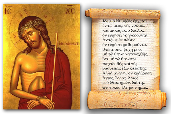 Τις βραδιές της Μεγάλης Εβδομάδας ο καθένας μας νιώθει ότι δεν είναι έτοιμος για την μεγάλη γιορτή του Κυρίου (την Ανάσταση) και ότι η στολή της ψυχής του είναι σχισμένη και λερωμένη από τις αμαρτίες του. Έτσι γεμάτος ταπείνωση ψάλει έναν εξίσου χαρακτηριστικό για την Μεγάλη Εβδομάδα ύμνο, τον: «Τον νυμφώνα σου βλέπω»